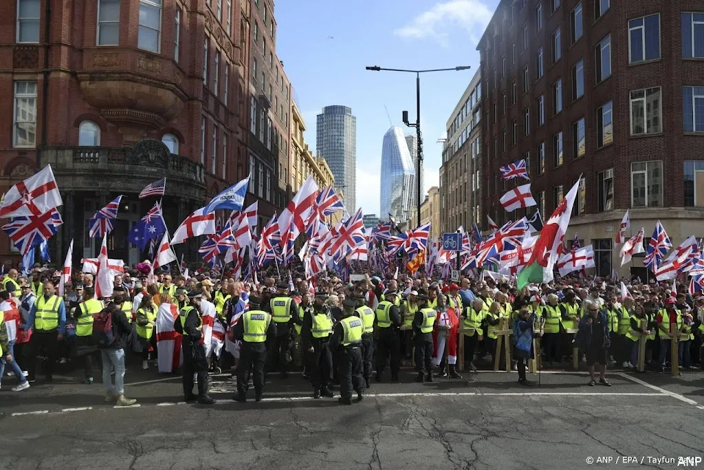 LONDEN (ANP/RTR) - De demonstratie van de radicaal-rechtse Tommy Robinson in Londen heeft meer dan honderdduizend mensen op de been gebracht. Er is ook een tegenbetoging, waar vooralsnog enkele duizenden demonstranten op af zijn gekomen.